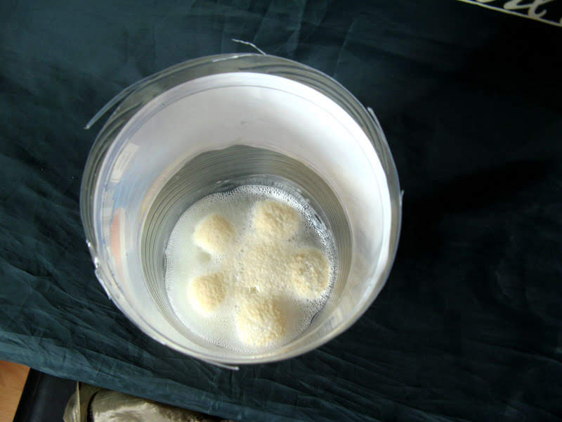这个灭蚊器其实就是一个可乐瓶+一点白糖水+1克酵母粉,仅此而已。我也是在网上知道得这个方法。可乐瓶从中上部剪断,里面倒进白糖水混上酵母粉然后把剪下来的上半部分瓶口朝下扣在瓶身的下半部上就ok了。据说这样,文字会自投罗网进到瓶子里然后找不到出口出来。效果不明显,因为家里文字不算太多,2、3只蚊子在1百多平民的家里找到这么个可乐瓶子钻进去也不是很容易的事。之所以在这里贴图示意,是因为这个这个“灭蚊器”放置了一夜之后,里面竟然发酵出了漂亮的固体小花: