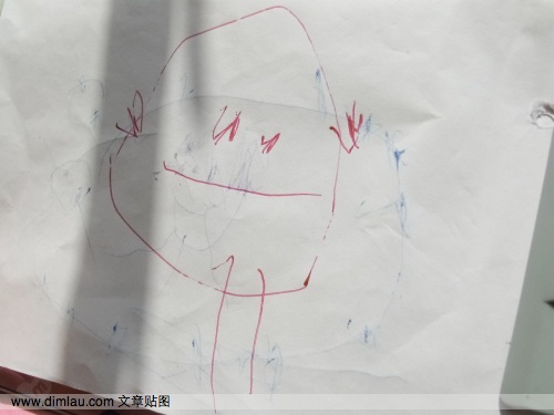 4、开心一直在纸上乱画,我看不下去了,引导她说,开心要不你画个妈妈吧,开心很爽快地答应了,于是有了这幅开心妈妈画像: