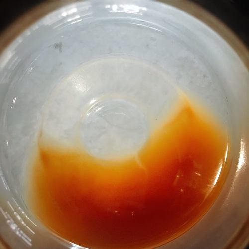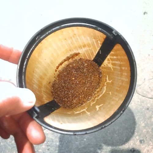 另外,即便是网格已经做得特别细密,但还是没法像滤纸那样过滤掉所有咖啡粉渣,所以做出的咖啡不会像用滤纸做的手冲那样清澈,在容器底部更是可以看见明显的粉渣: